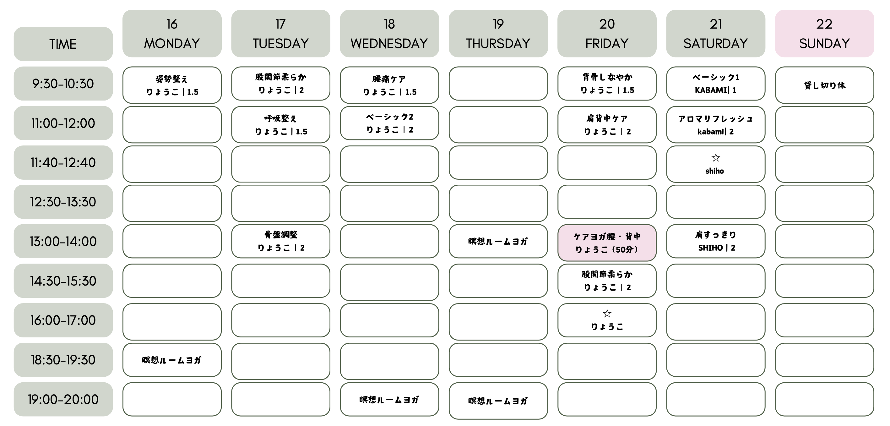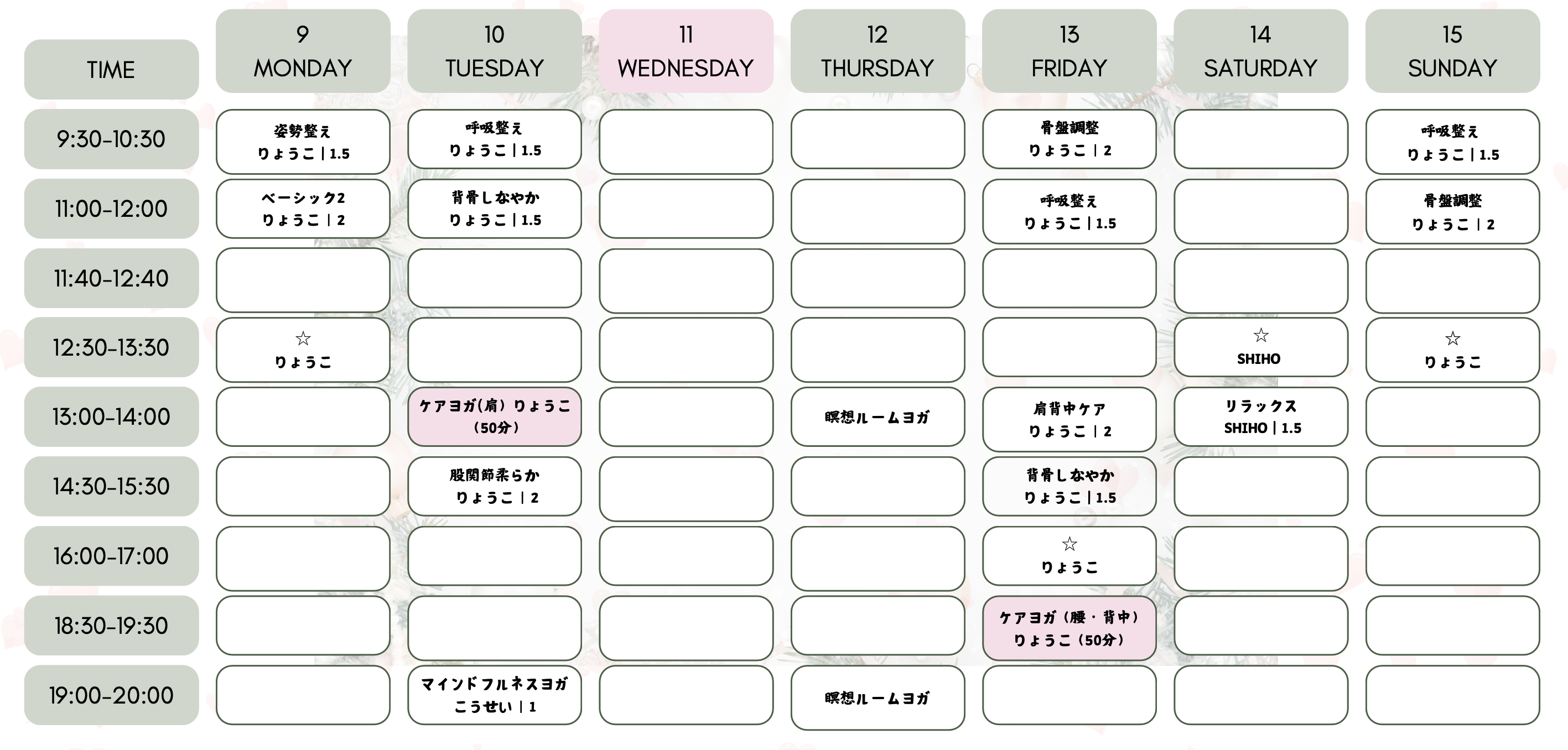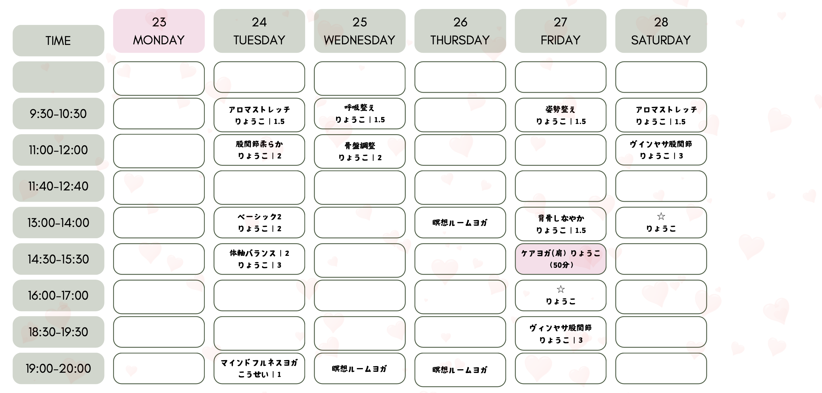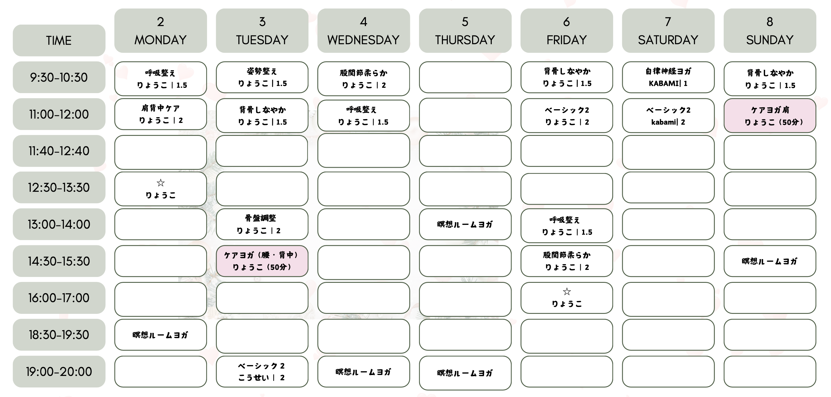 HOMEレッスンスケジュールレッスンスケジュール 1月レッスンスケジュール ※インストラクターの都合上 休止や変更するレッスンがあります。 レッスン申し込みページへ 2月レッスンスケジュール ※インストラクターの都合上 休止や変更するレッスンがあります。 レッスン申し込みページへ 毎月、スタッフみんなで新レッスンを考えています。 また、レッスン強度なども検討しております。 ご希望のレッスンがございましたら お知らせください。